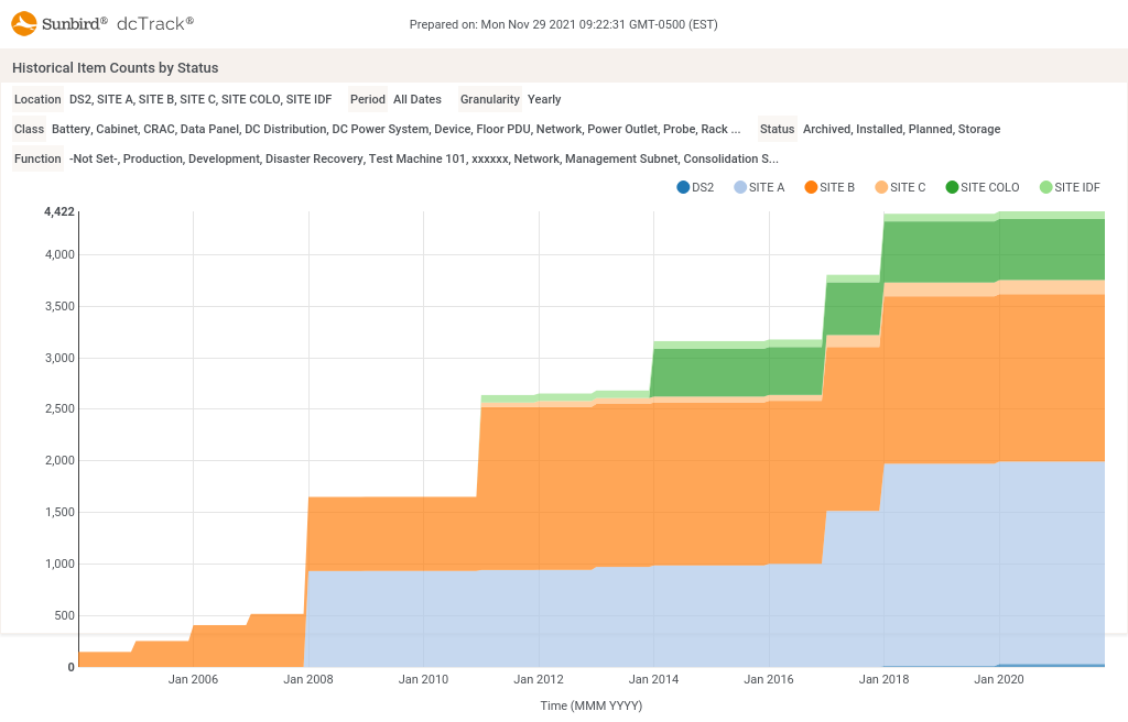 Shows for the period and granularity selected the count of items by location and status filtered by Class and Function.