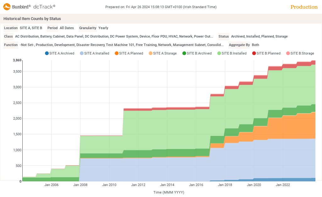 Shows for the period and granularity selected the count of items by location and status filtered by Class and Function.