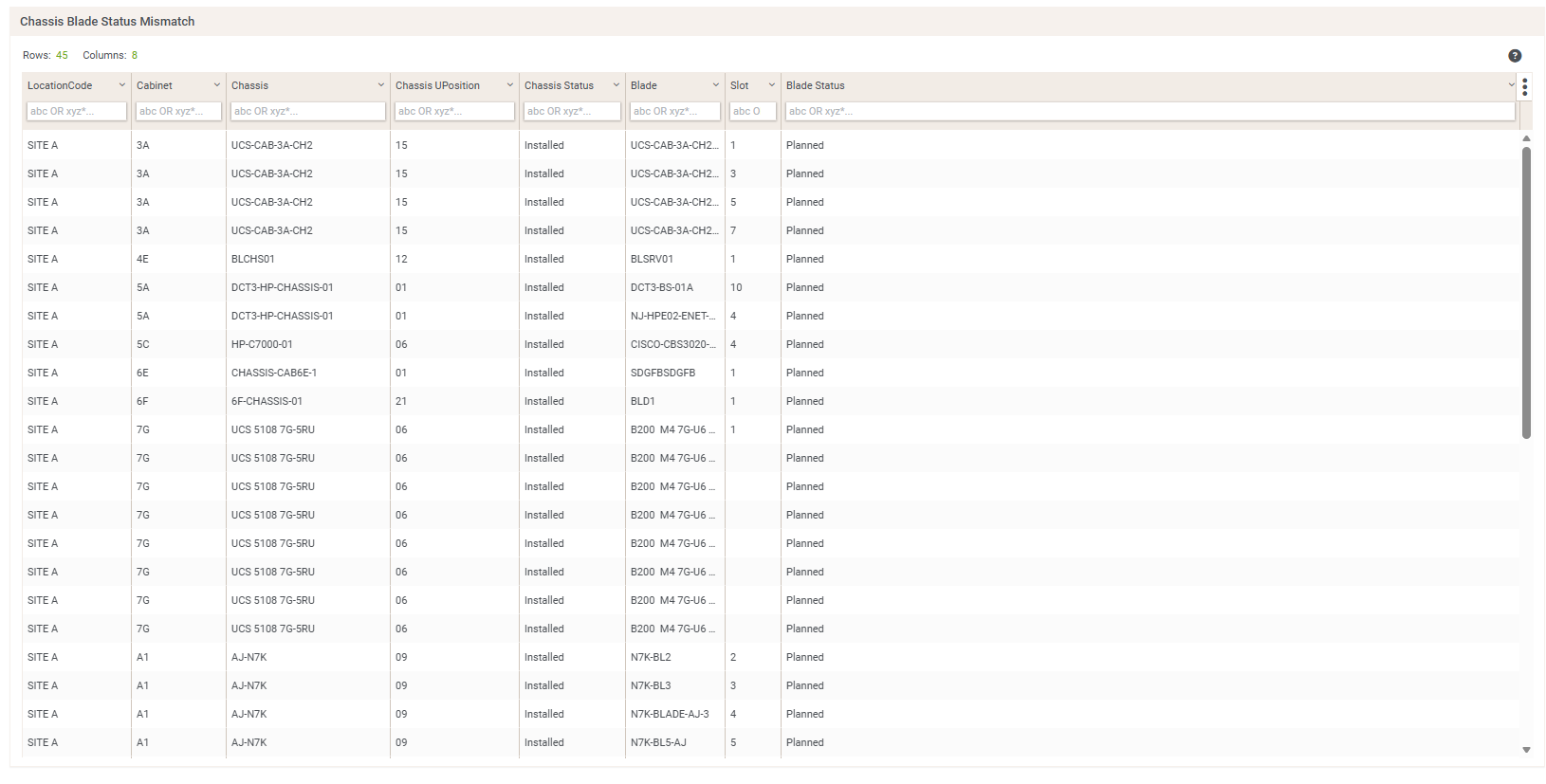 This is a grid widget, a tabular dataset displaying details for chassis and blades where the chassis' status and the blade's status do not match.