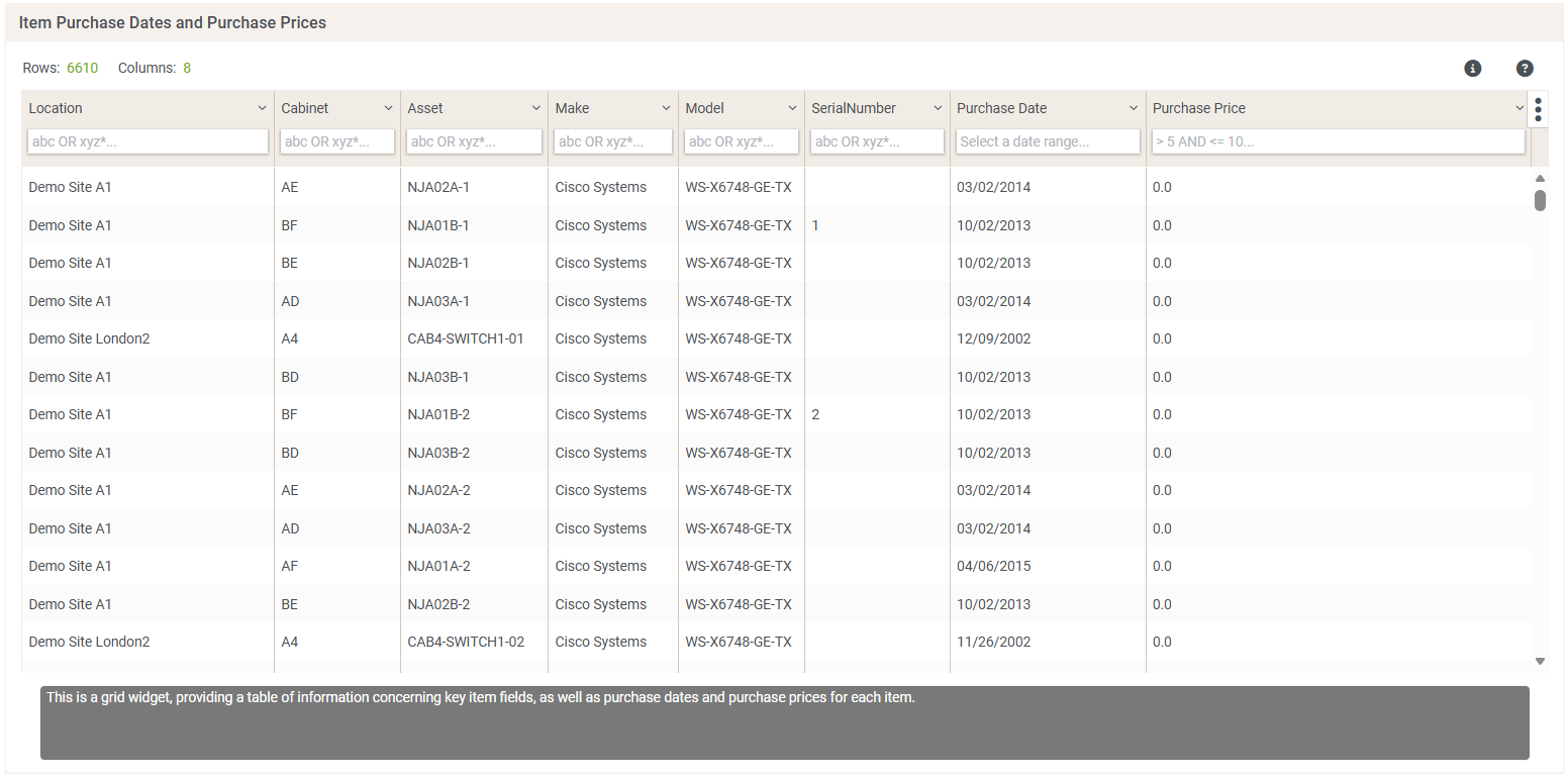 This is a grid widget, providing a table of information concerning key item fields, as well as purchase dates and purchase prices for each item.