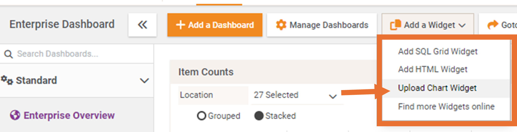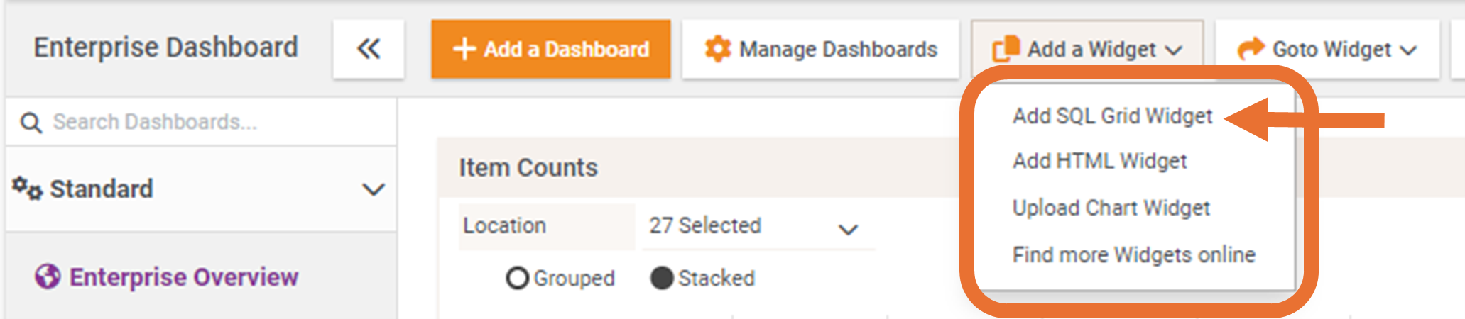 2. Click Add a Widget on the Dashboard tab menu. (Note: This can be any dashboard except the Enterprise Health dashboard.)