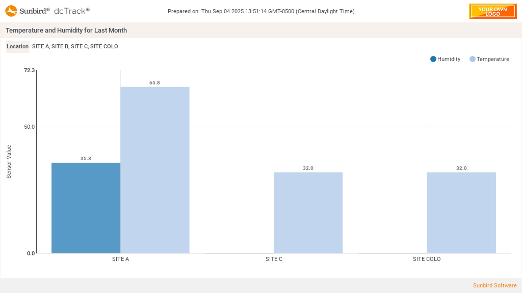 Shows 1 bar for the average daily temperature last month and 1 bar for the average daily humidity last month per data center.