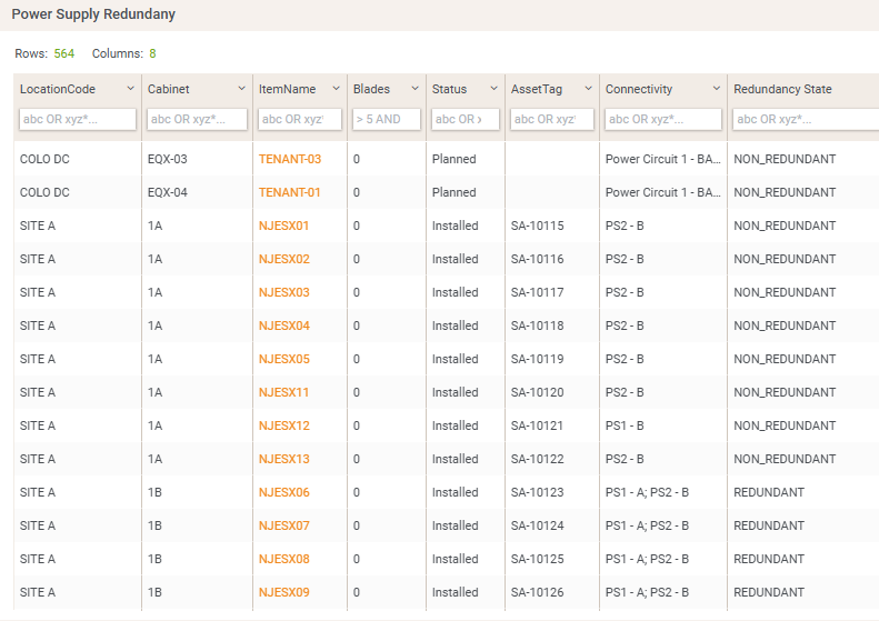 This SQL grid widget shows you which downstream UPS bank a Power Supply is connected and determine whether the asset is redundant.