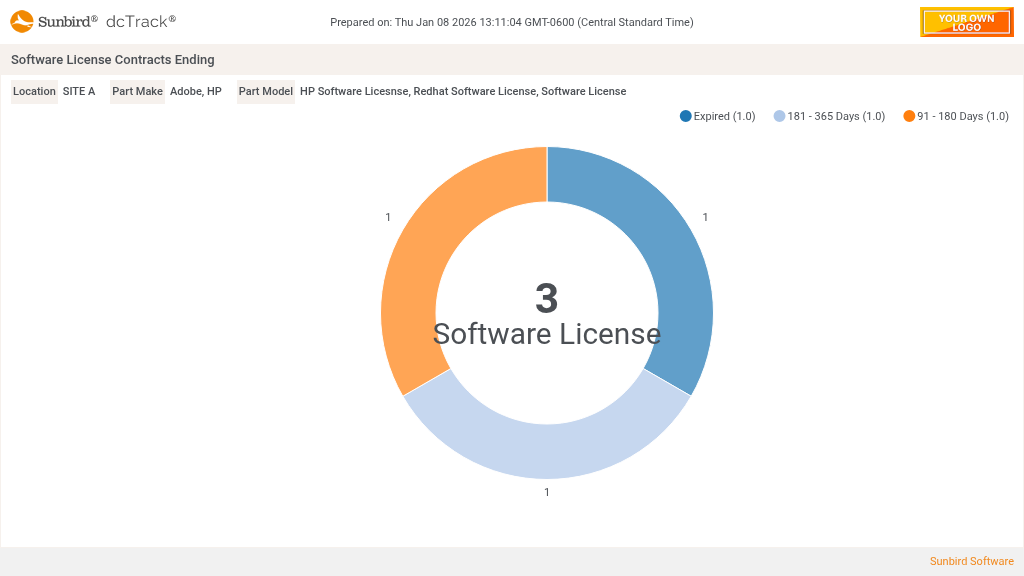 Shows how many software license in each date range are approaching their contract end date. A software license is represented by a Part with the Class 'License'. The Part Custom Field used to determine the ending contract date is 'Coverage End Date'.