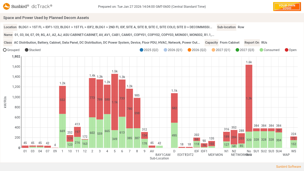 Shows the number of Rack Units or kW in each sub-location (Cabinet, Row, or Aisle) that fall in 3 categories. 'Consumed' are rack units/kW in use from items not in Archived, Storage or Planned Decommission status. 'Open' are rack units/kW available that are currently available without adding the Planned Decommission assets. The remaining series show the rack units/kW in use for items in the Planned Decommission status by the quarter and year they fall into. This widget looks at the Planned Decommission assets that have a Planned Decommission Date 1 year prior to the current date and the upcoming two years.